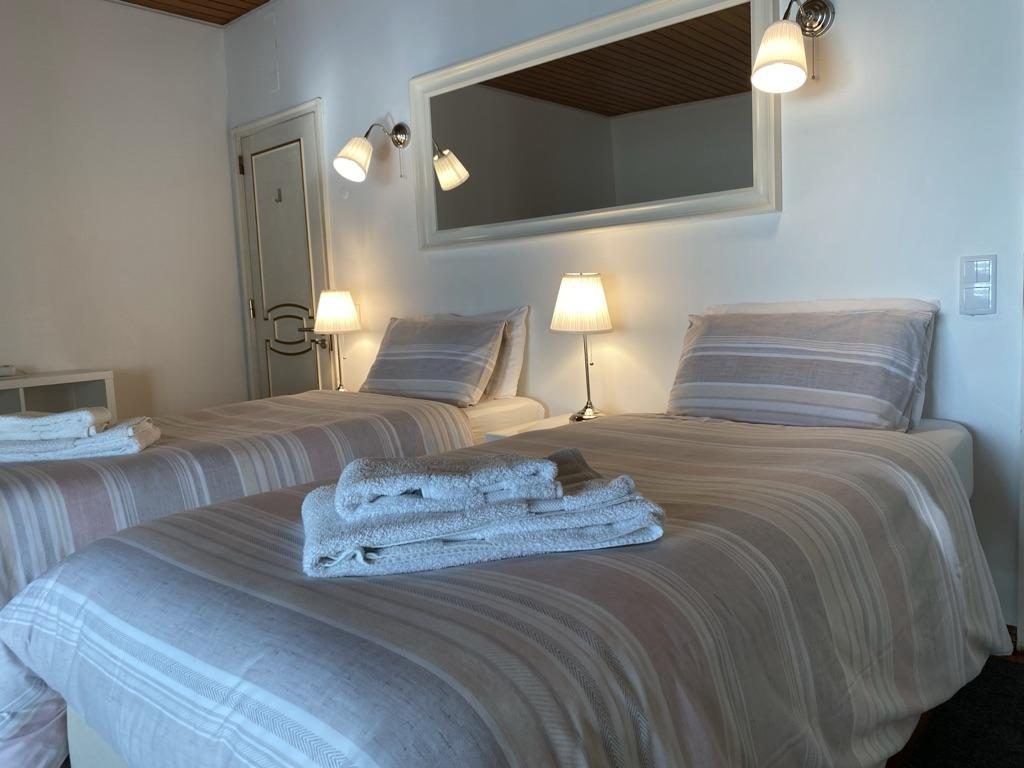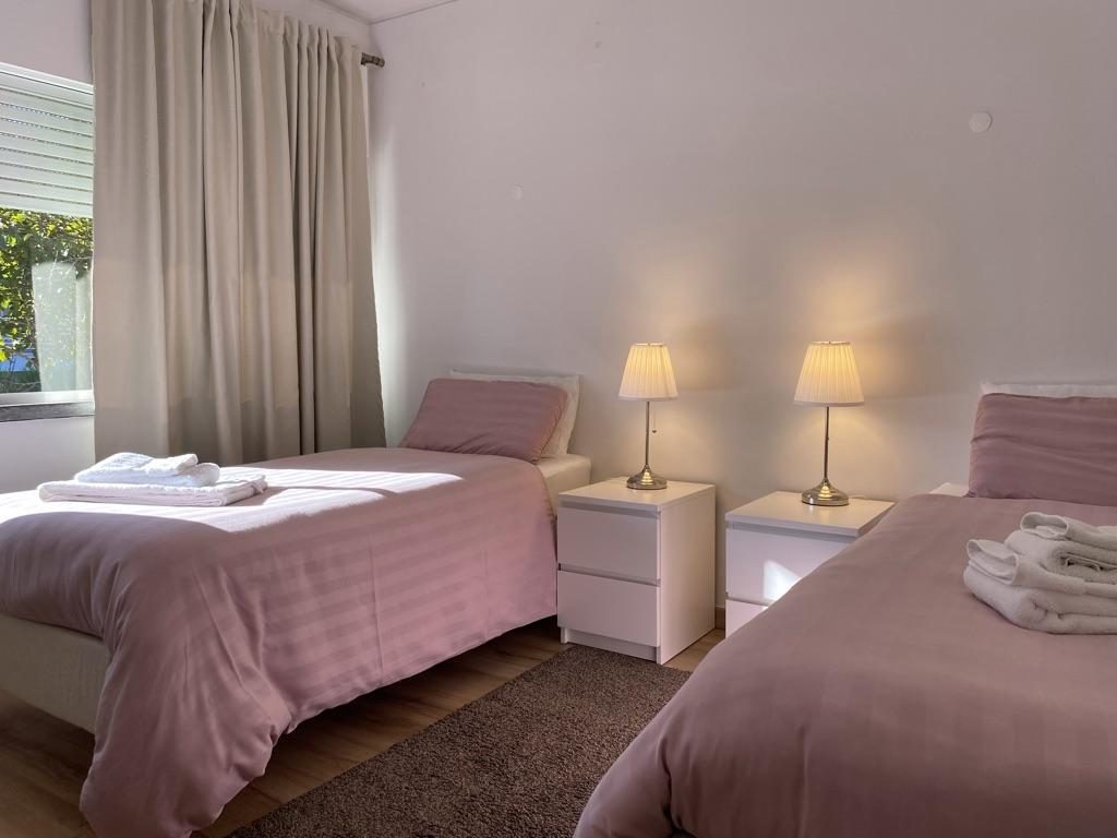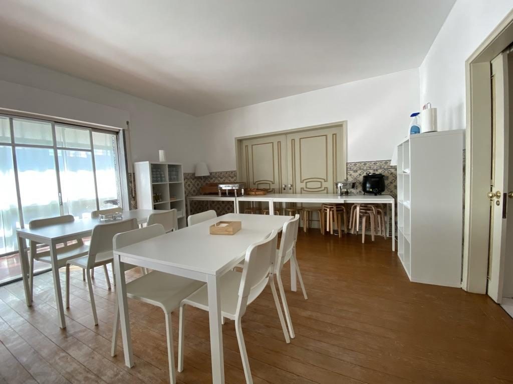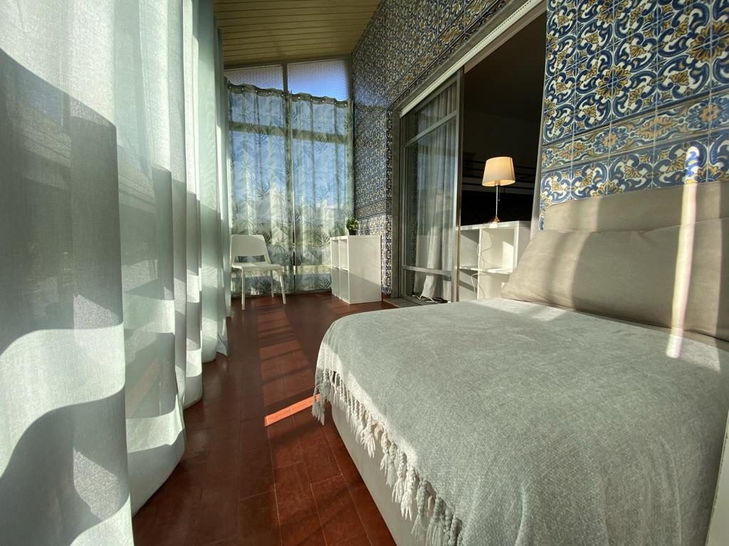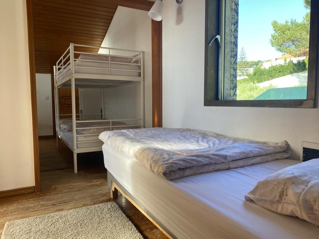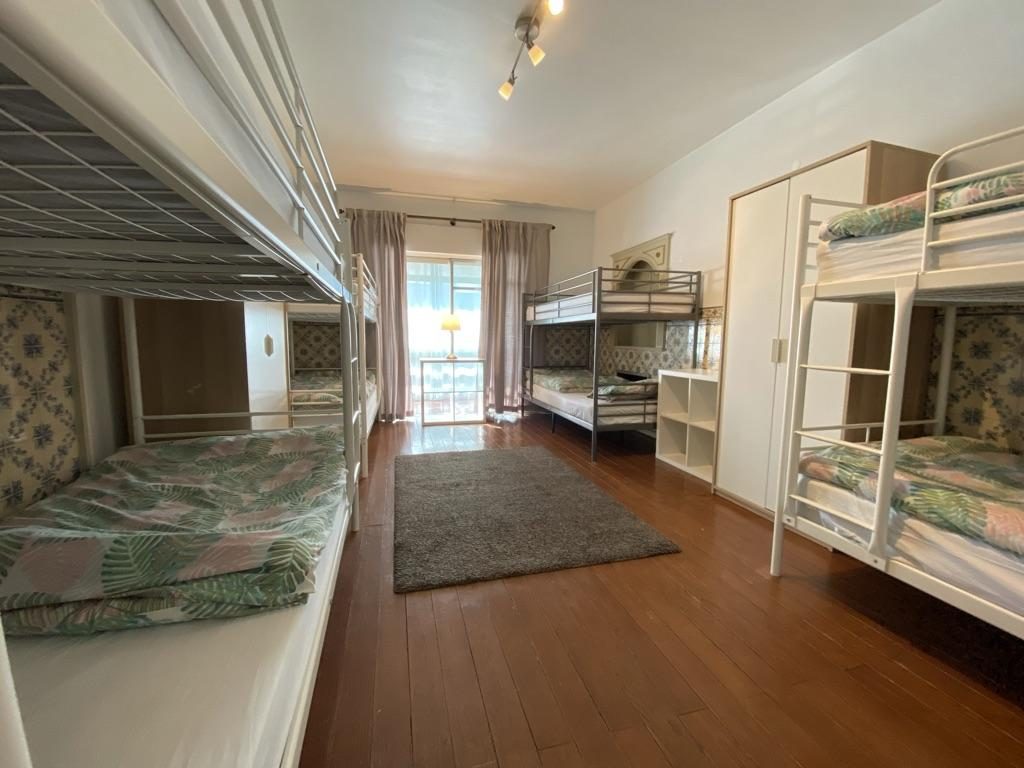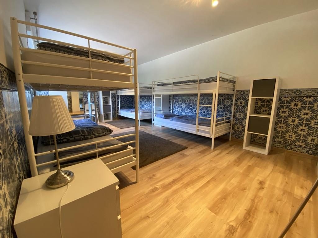 Comfortable shared rooms with traditional azulejo tile accents, bunk beds, and natural light.